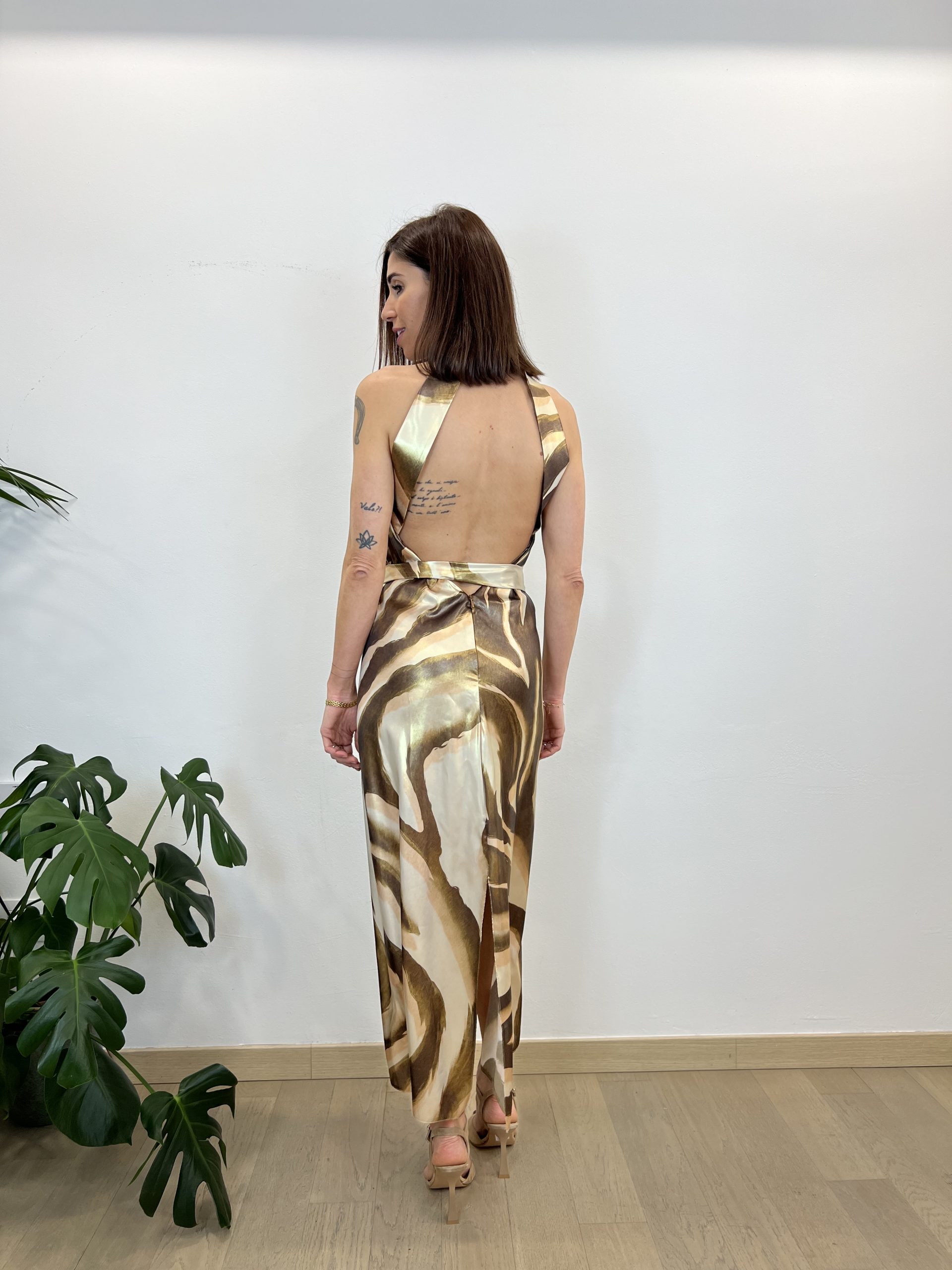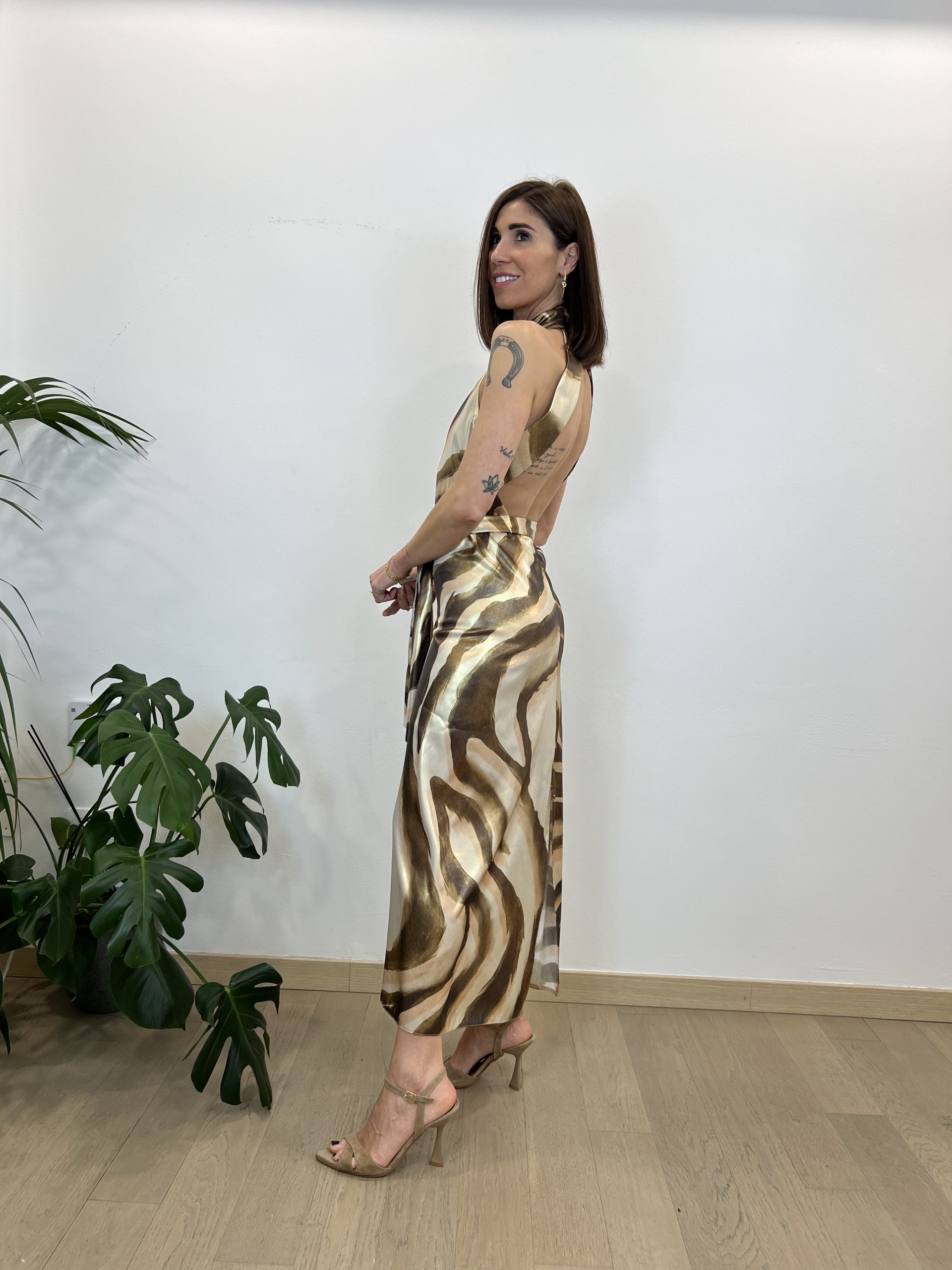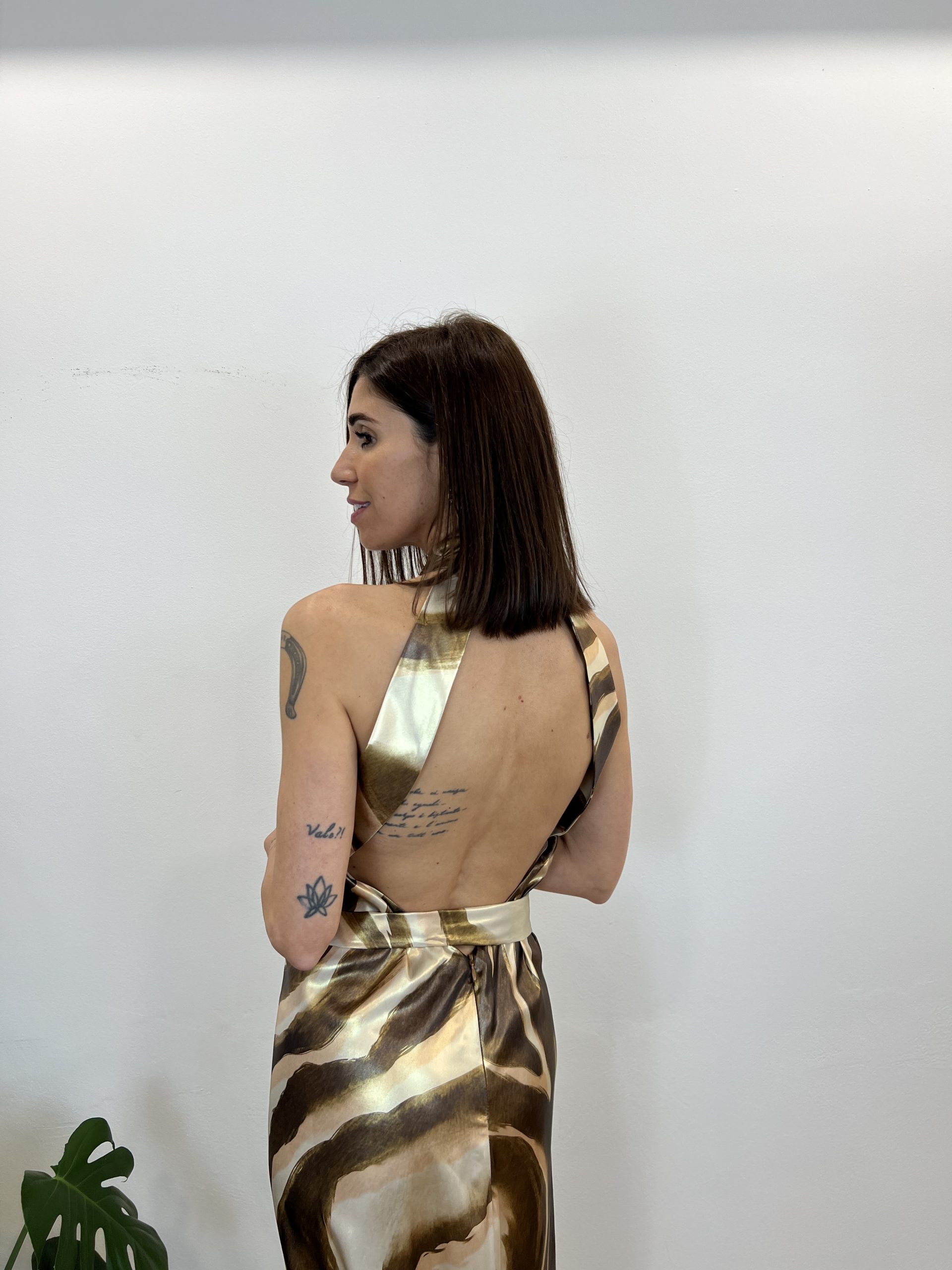 La fantasia zebrata nei toni caldi del bronzo e Beige dona movimento e carattere al capo, rendendolo ideale per occasioni estive, eventi serali o look sofisticati da vacanza.